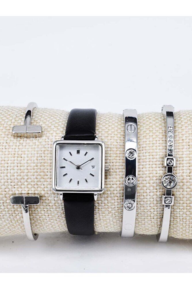 3 Adet Bileklikli Kadın Kol Saati Kare Kasa Siyah Deri Kordon Gümüş Şık Analog Kombin Saat Modeli