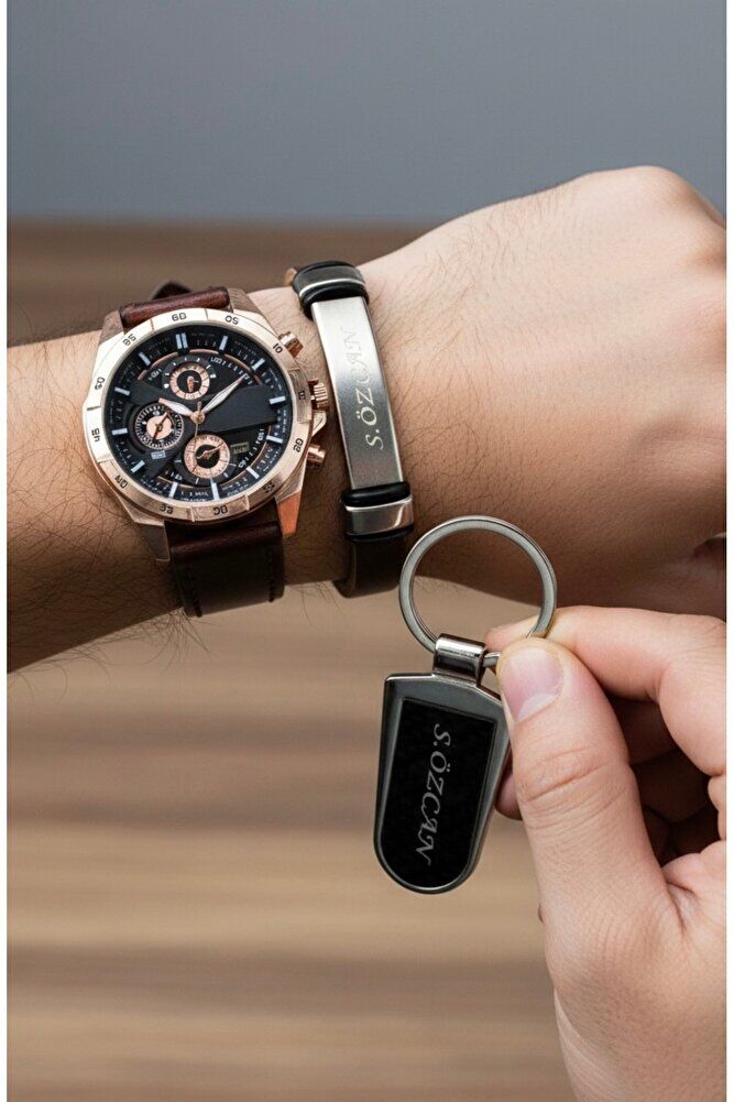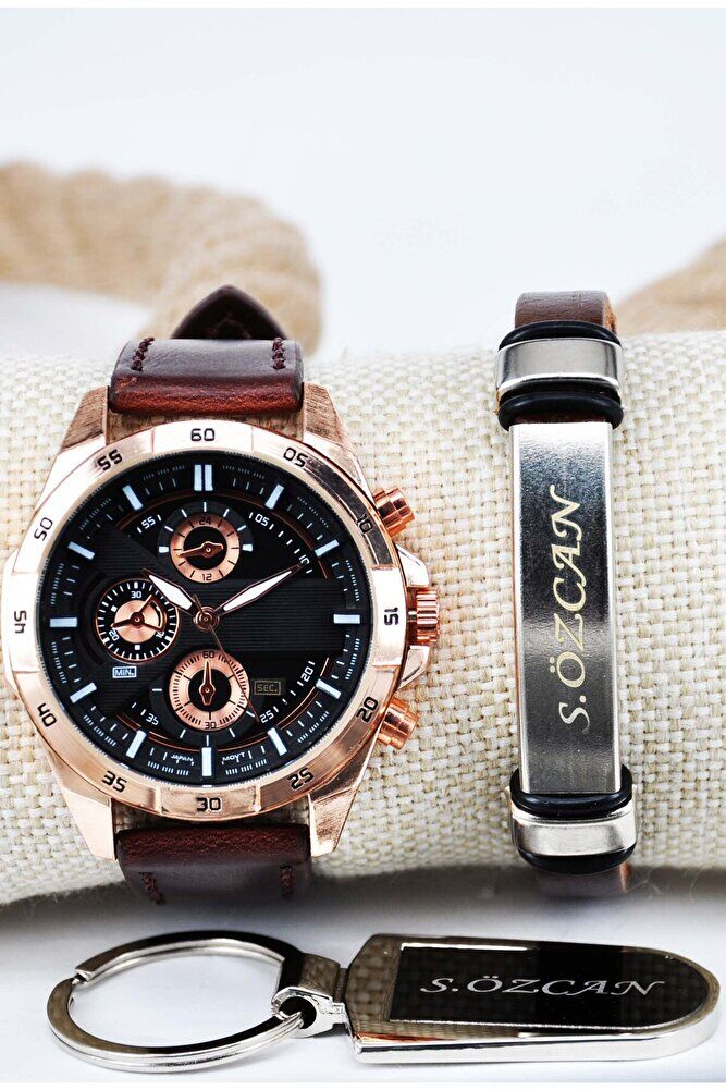 Erkek Kol Saati Deri Kordon Bileklik ve Anahtarlık Seti Quartz Şık Klasik Hediye Saat Set Modeli