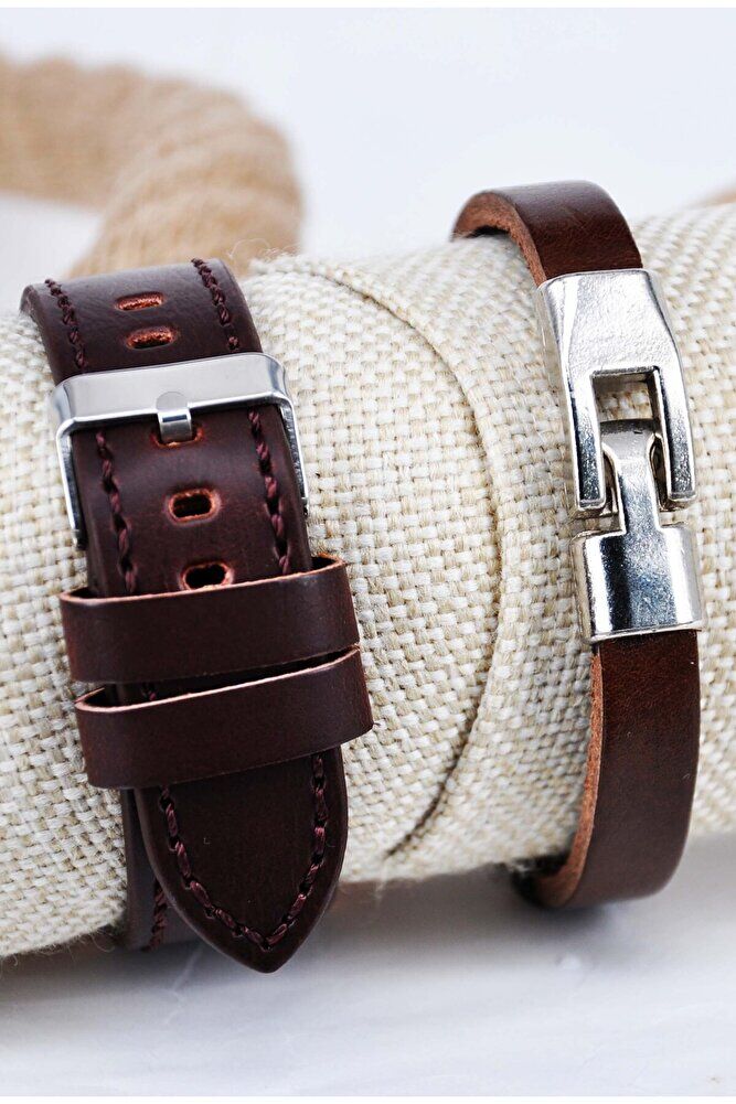 - Metal kasa materyali ile dayanıklılığı artırılmış, uzun ömürlü kullanım sunar.; - Quartz mekanizması sayesinde zamanı hassas ve doğru bir şekilde takip eder.; - Deri kordon materyali, şık görünümün yanı sıra konforlu bir kullanım sağlar.; - Yetişkin kullanıcılar için idealdir; her yaş grubuna hitap eder.; - Mineral cam tipi, çizilmelere karşı koruma sağlayarak saatinizin ekranını güvende tutar.; - Düz cam şekliyle modern ve zarif bir tasarıma sahiptir.; - Bakır kasa rengi, klasik ve sofistike bir stil oluştururken aynı zamanda farklı kombinlere uyum sağlar.; - 1 ATM su geçirmezlik özelliği ile günlük su sıçramalarına karşı dayanıklılık gösterir.; - Kişiye özel kutusuyla hediye olarak da tercih edebileceğiniz bu set, hem erkek arkadaşınızın hem de kendinizin tarzını tamamlar.