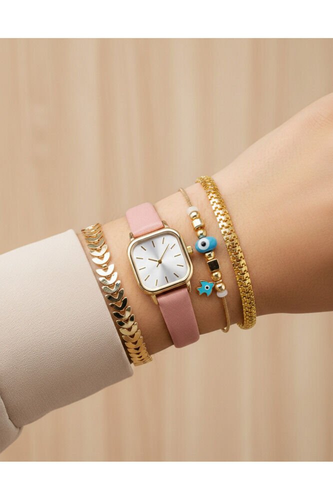 Pembe Deri Kordon 3 Adet Bileklikli Şık Zarif Sade Genç Kız Kadın Kol Saati