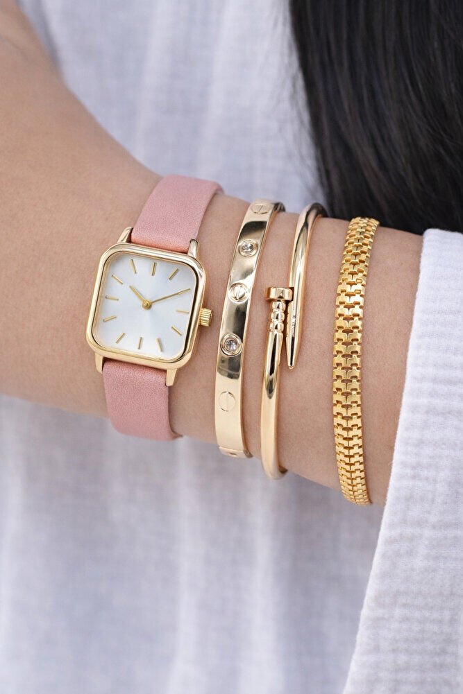 Pembe Kordon Şık Kadın Saati & Çivili Tırtıl ve Taşlı Bilekliklerle Beraber SU-795