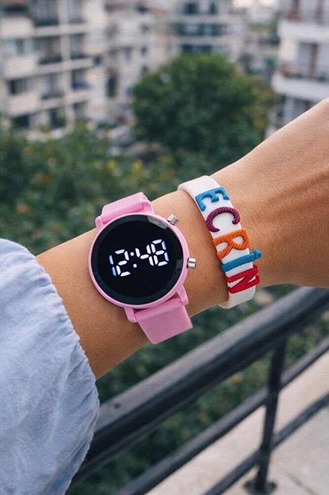 Renkli ve Eğlenceli Tasarım: Pembe LED Dijital Çocuk Kol Saati ve İsimli Bileklik