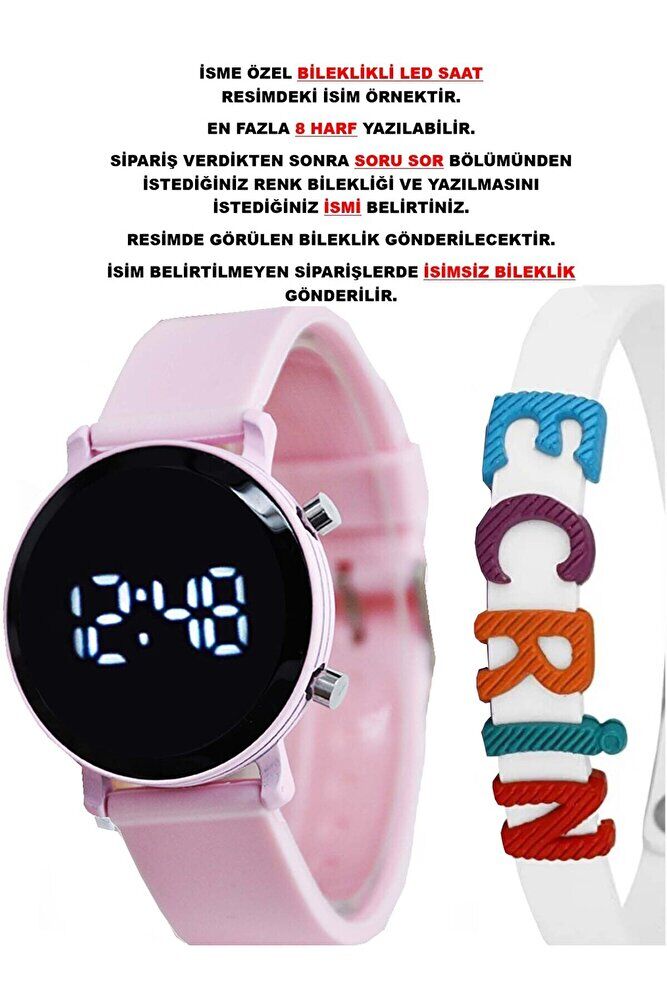 Pembe Silikon Kordon Yuvarlak Kasa İsimli Bileklikli Şık Şirin Tasarım Kız Çocuk Led Saat
