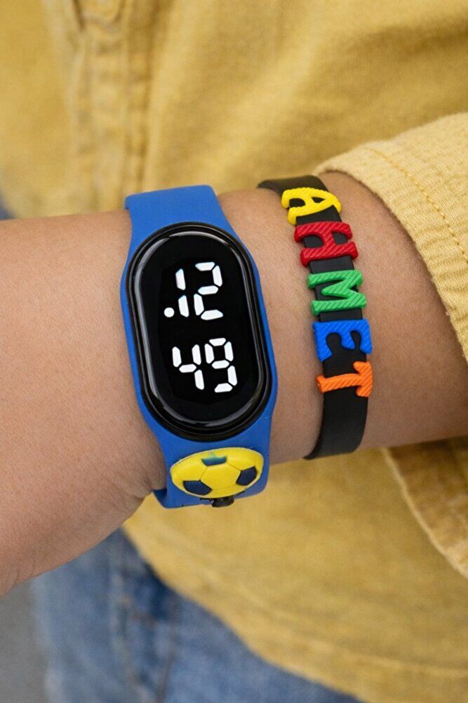Sarı Lacivert Top Figürlü İsimli Bileklikli Dokunmatik Led Çocuk Kol Saati